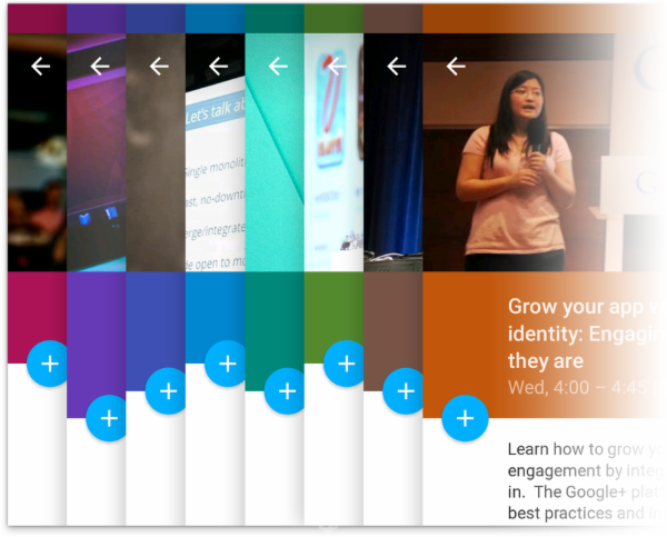 一张与屏幕等宽,竖方向占据半个屏幕左右的大图,去掉action bar,只保留返回按钮的设计,在一两年前十分流行的summly应用上就已经非常火了。后续也有一些应用跟进这样的设计(例如淘宝),但并没有大面积流行起来。Material Design很大胆地使用了这样的设计。在Google的引导下,这样的设计风格将很有可能风靡起来。